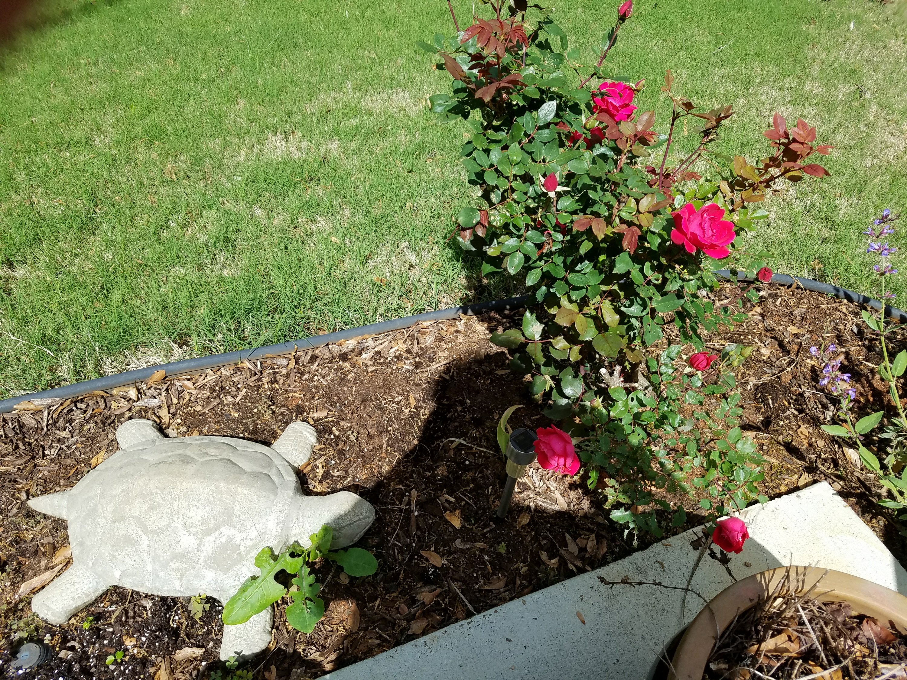 Myrtle the Turtle likes smelling the roses and is happy too.