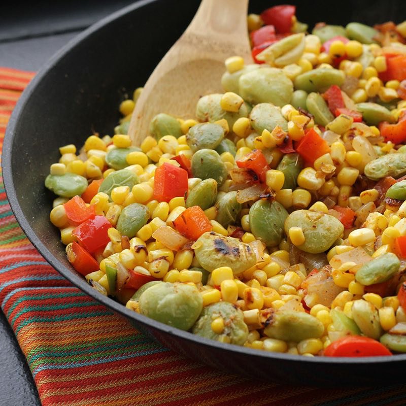 In addition to the corn and lima beans, peppers, zucchini, onion, garlic and tomatoes are cooked with some seasoning to make an awesome side dish.