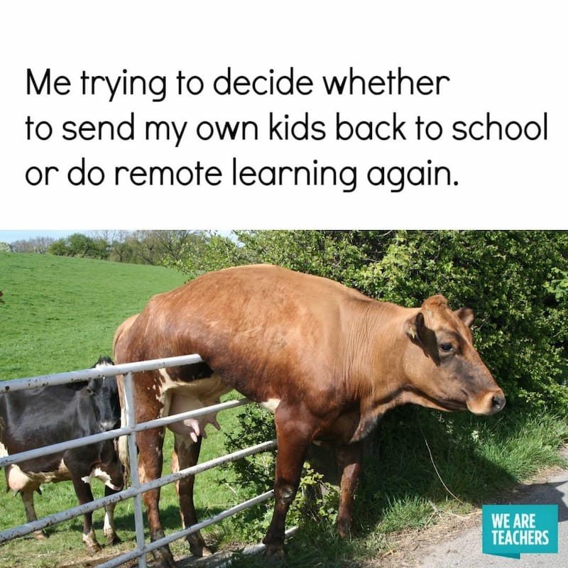 Ha ha…great photo. It is a difficult decision for many parents, especially parents of younger children. My daughter is in high school and they are returning under an “adapted learning” model, meaning she will go to school 50% of the time but only for one class, half the day. The other half of her “in school” day will be live, synchronous at-home learning. On her “not in school” days, she will do course work.