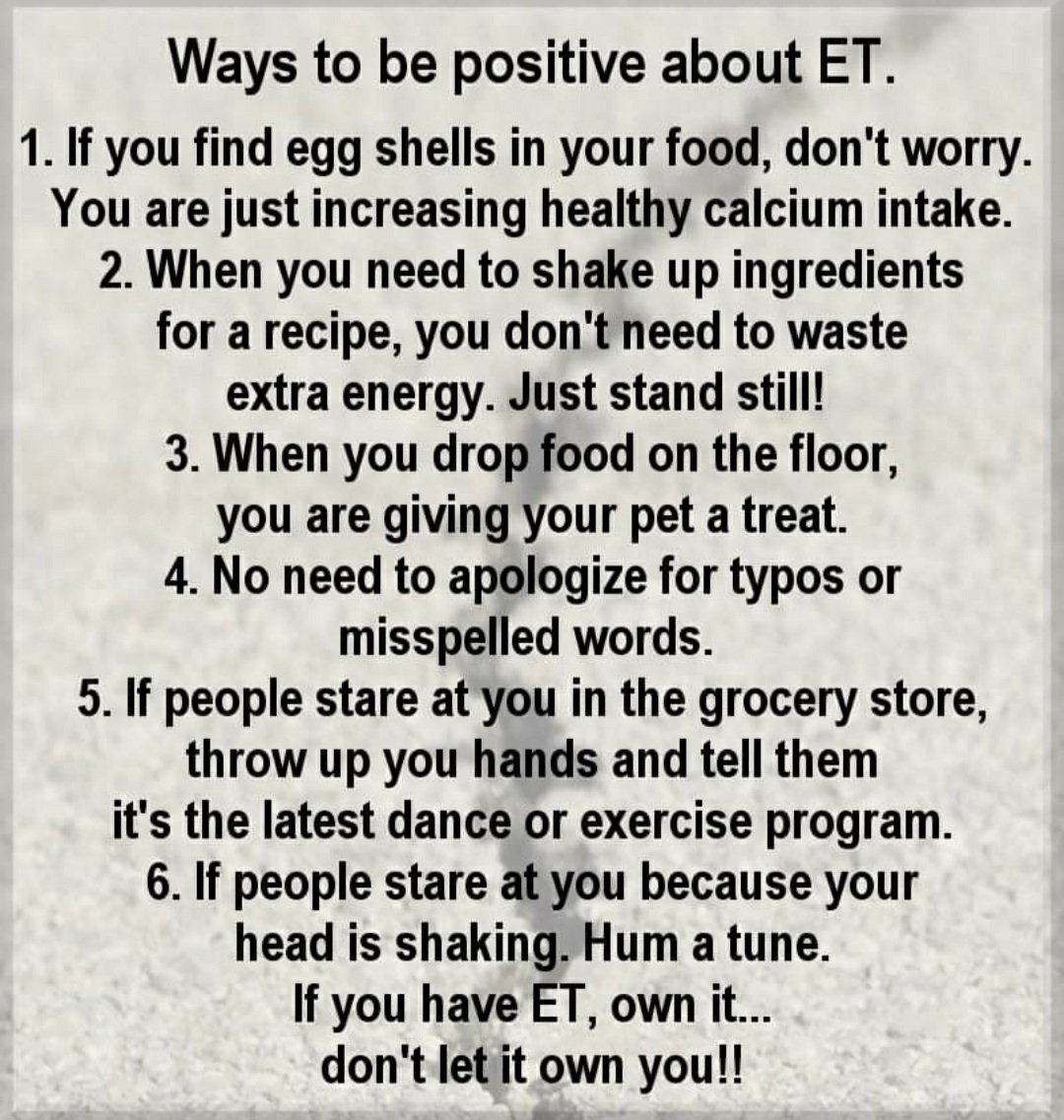 Staying Positive -Tremor Tuesday On August 25, 2020August 24, 2020 By Miss JudyIn Life and Living If you have ET, own it. Don’t let it own you ! Be positive with ET Share this: Click to share on X (Opens in new window) X Click to share on Facebook (Opens in new window) Facebook Click to share on Pinterest (Opens in new window) Pinterest Click to email a link to a friend (Opens in new window) Email Like Loading... Related