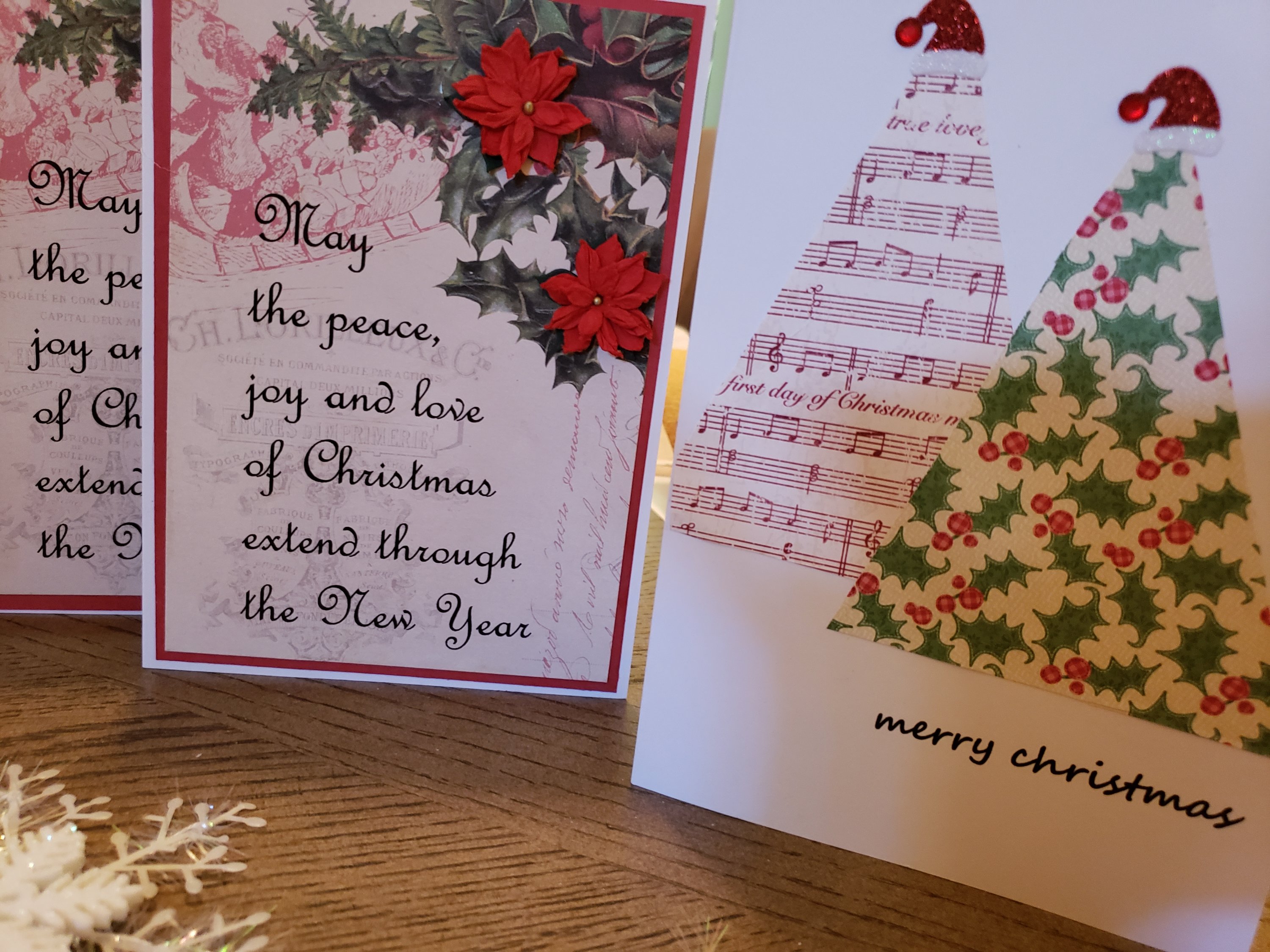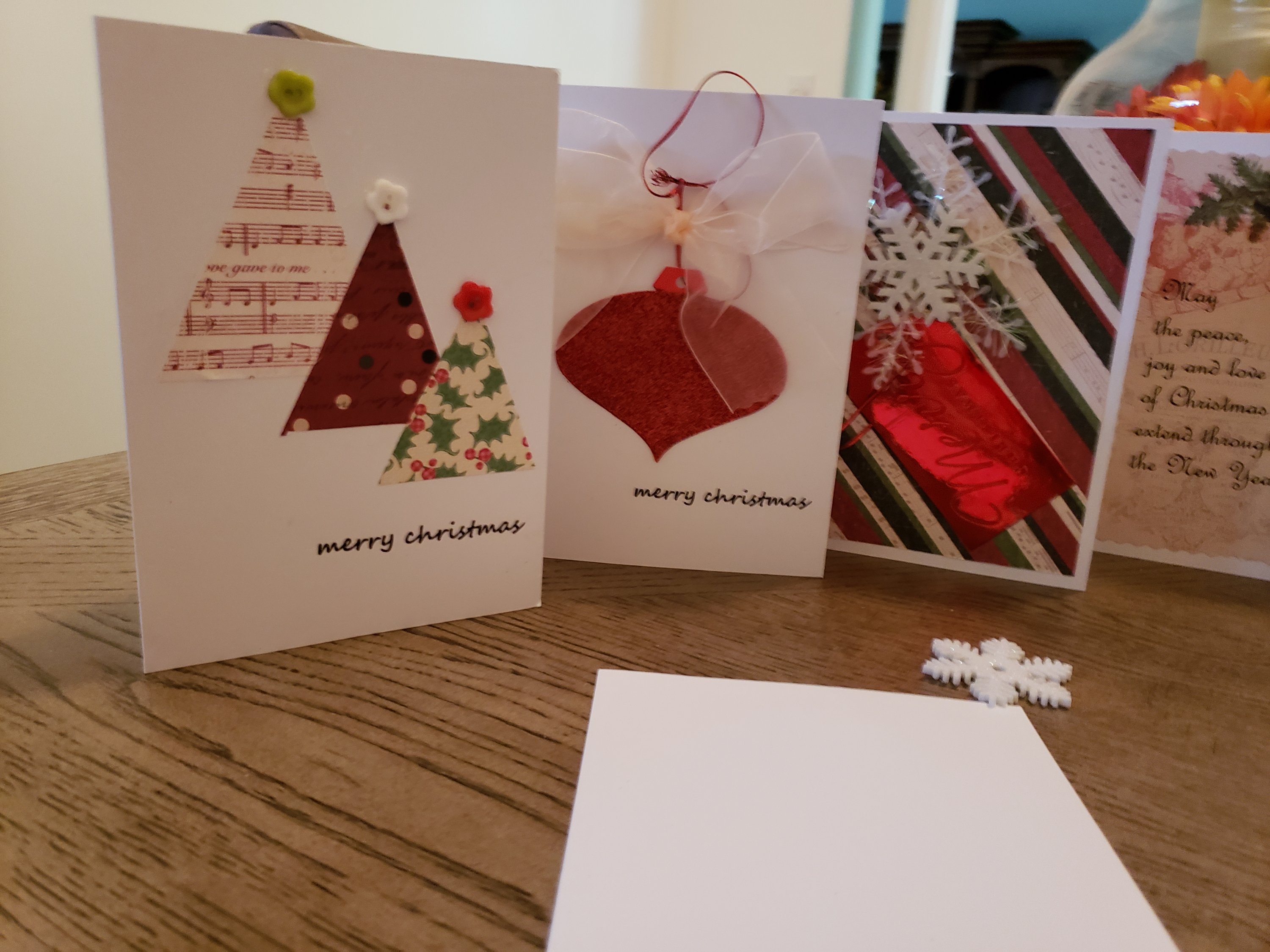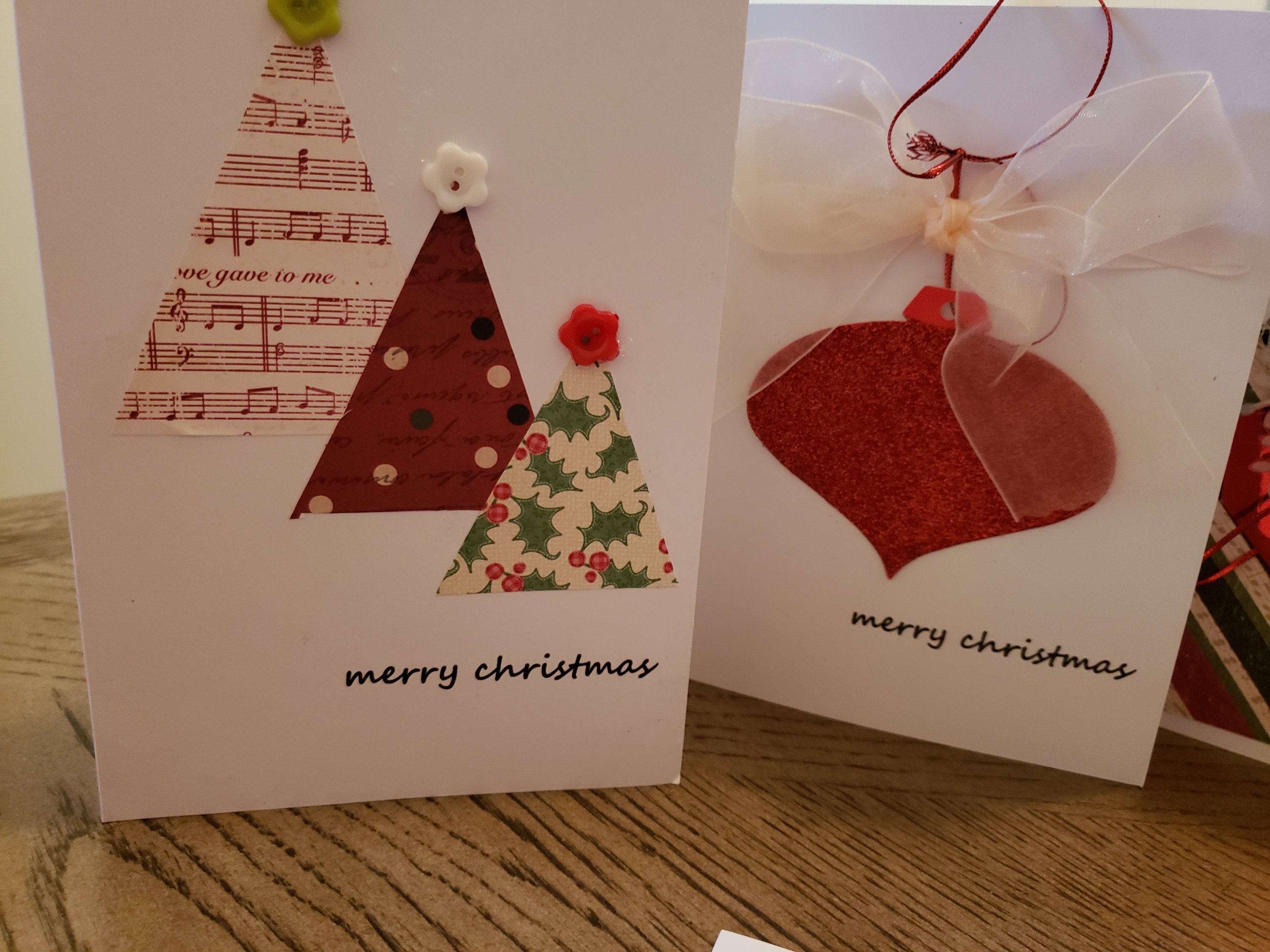 In these cards, craft paper is used to create Christmas tree shapes with button tree toppers. A sparkling gift tag and bow adorn another. While another card is layered craft paper, snowflake embellishments and a Merry Christmas gift tag. Lettering is printed from my computer.