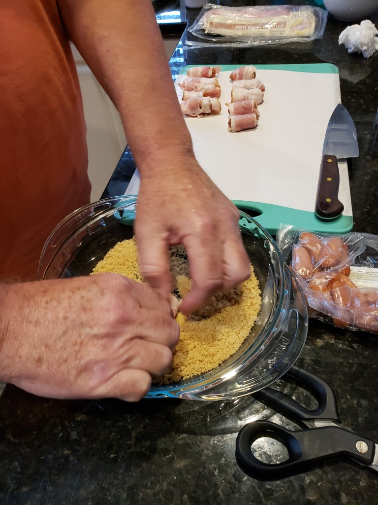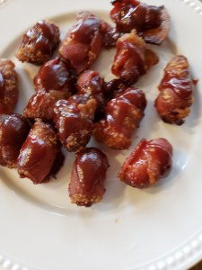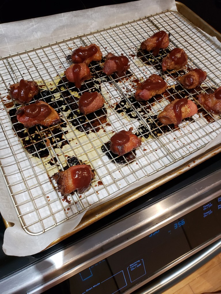 So, to kick-off the week, we start with a super easy, delectable treat – bacon wrapped mini hot dogs with an extra treat – brown sugar. (Diet starts next year.)