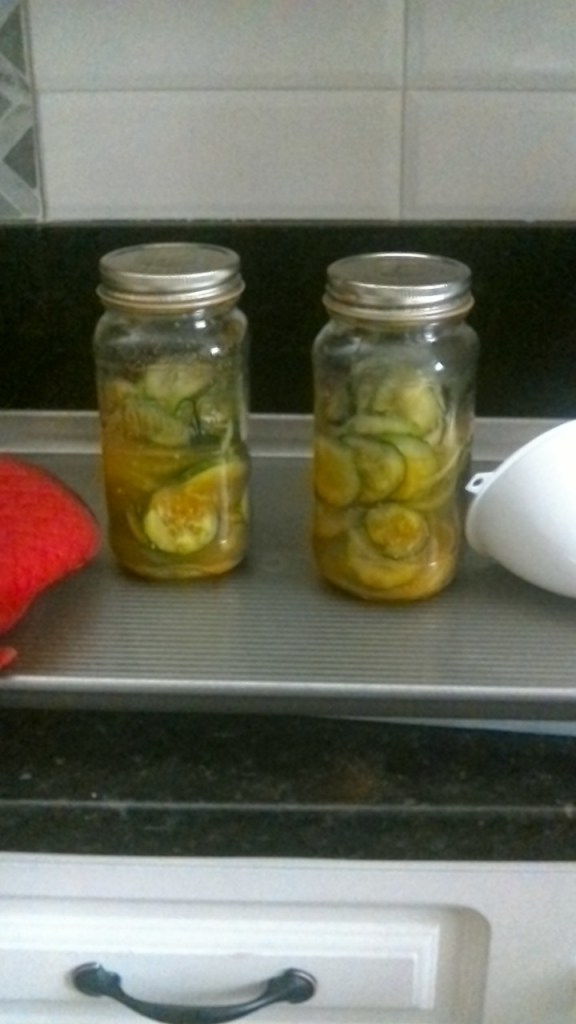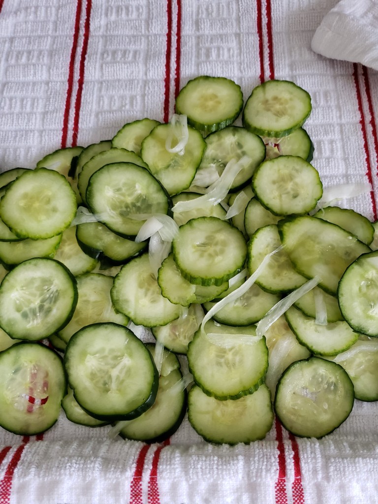 While chatting with my aunt this week she was lamenting on all rhe cucumber plants she has started. One thing led to another and I remembered I had gotten several in my produce box this week. I needed to use them. Mom, until a few years ago, would make a jar of bread and butter pickles for the frig., so I decided to give it a try. I found a recipe, checked the ingredients (surprise, I had everything) and went to work.
