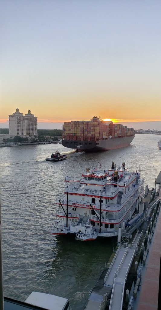 When we visited Savannah, there were 40 ships sitting out at sea waiting to come into port and be unloaded and reloaded. We were told some had been out there as long as 2 months. I guess we don’t have to wonder why there are supply-chain problems. Savannah is roughly 18 miles inland; you can imagine what a slow process it is for ships to get in and out.