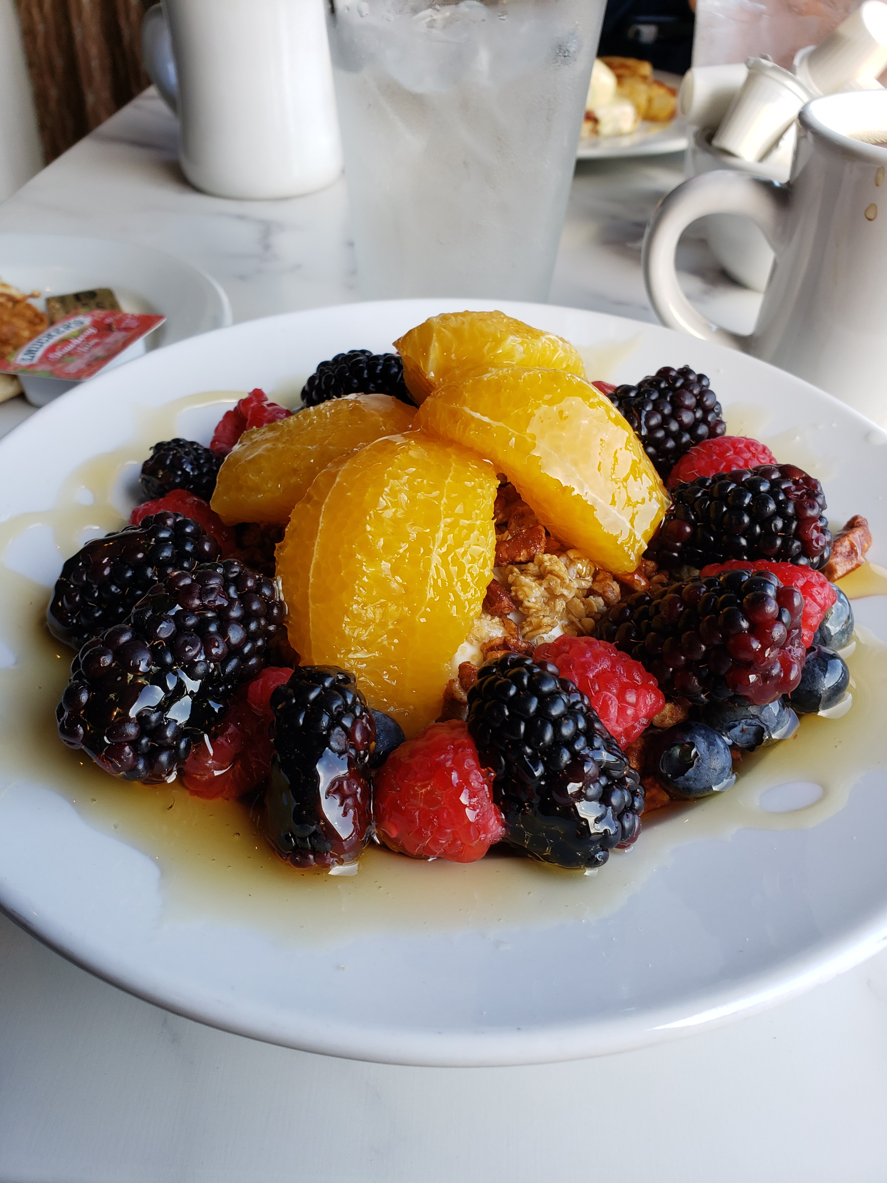 The restaurants serve some very fine food, from burgers and fries to steak, seafood, and delicious pastires and desserts., And they do not serve MINI portions as evidenced by my breakfast of yogurt and fruit! Blackberries were as big as my thumb!