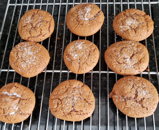 The aromas wafting through the house today truly say Christmas! The combination of molasses, cinnamon and ginger is amazing and brings back memories of visits to my grandmother’s house; she always had these in her cookie jar. In addition to the great taste, they come with an added bonus — they have no sugar. The sweetness comes from the molasses. (Although I did sprinkle the tops just out of the oven. It’s optional.)